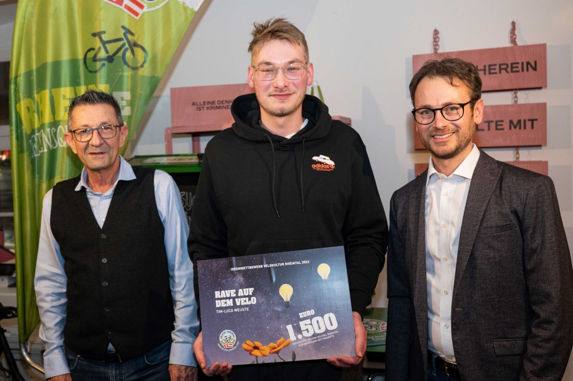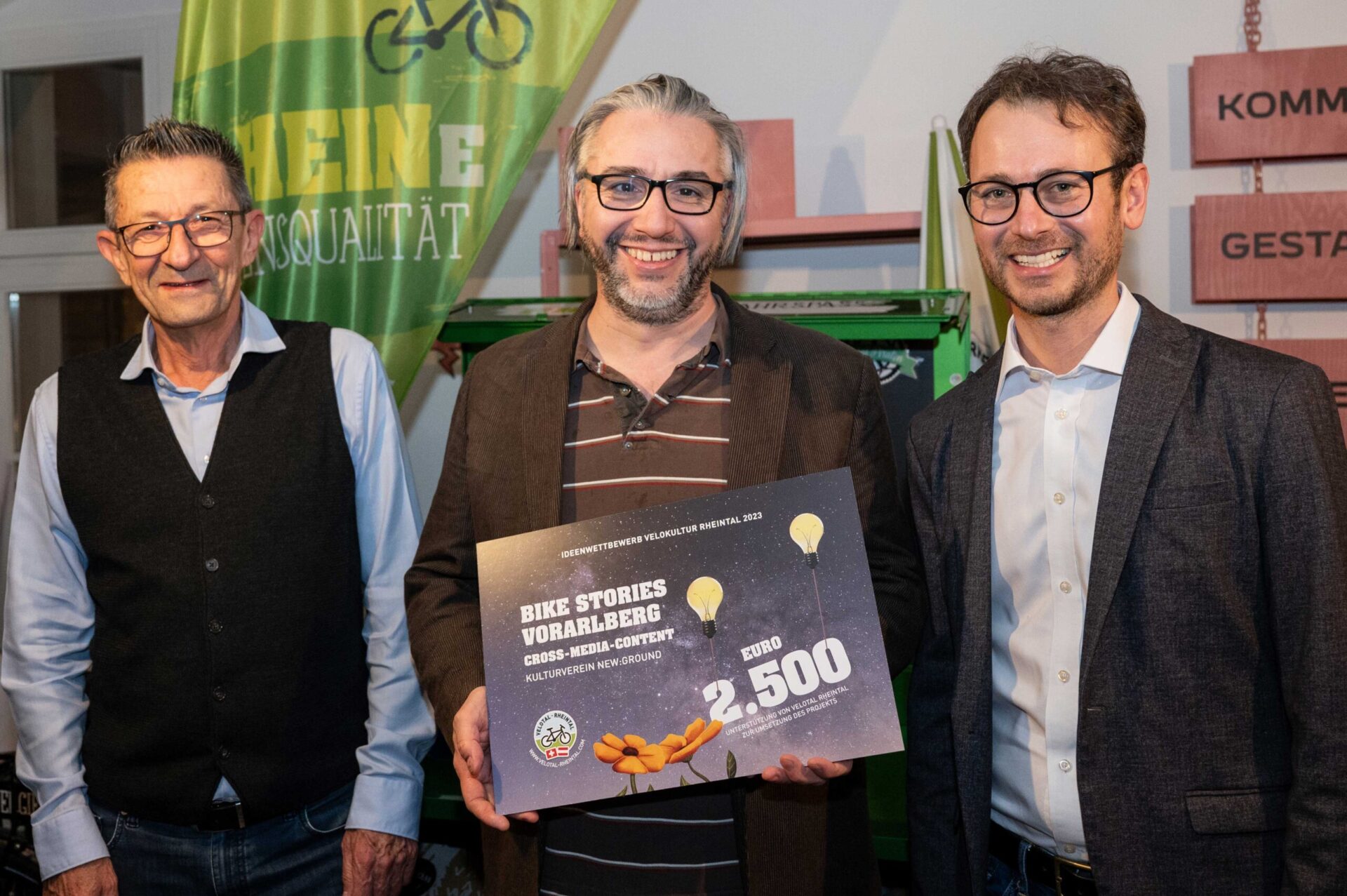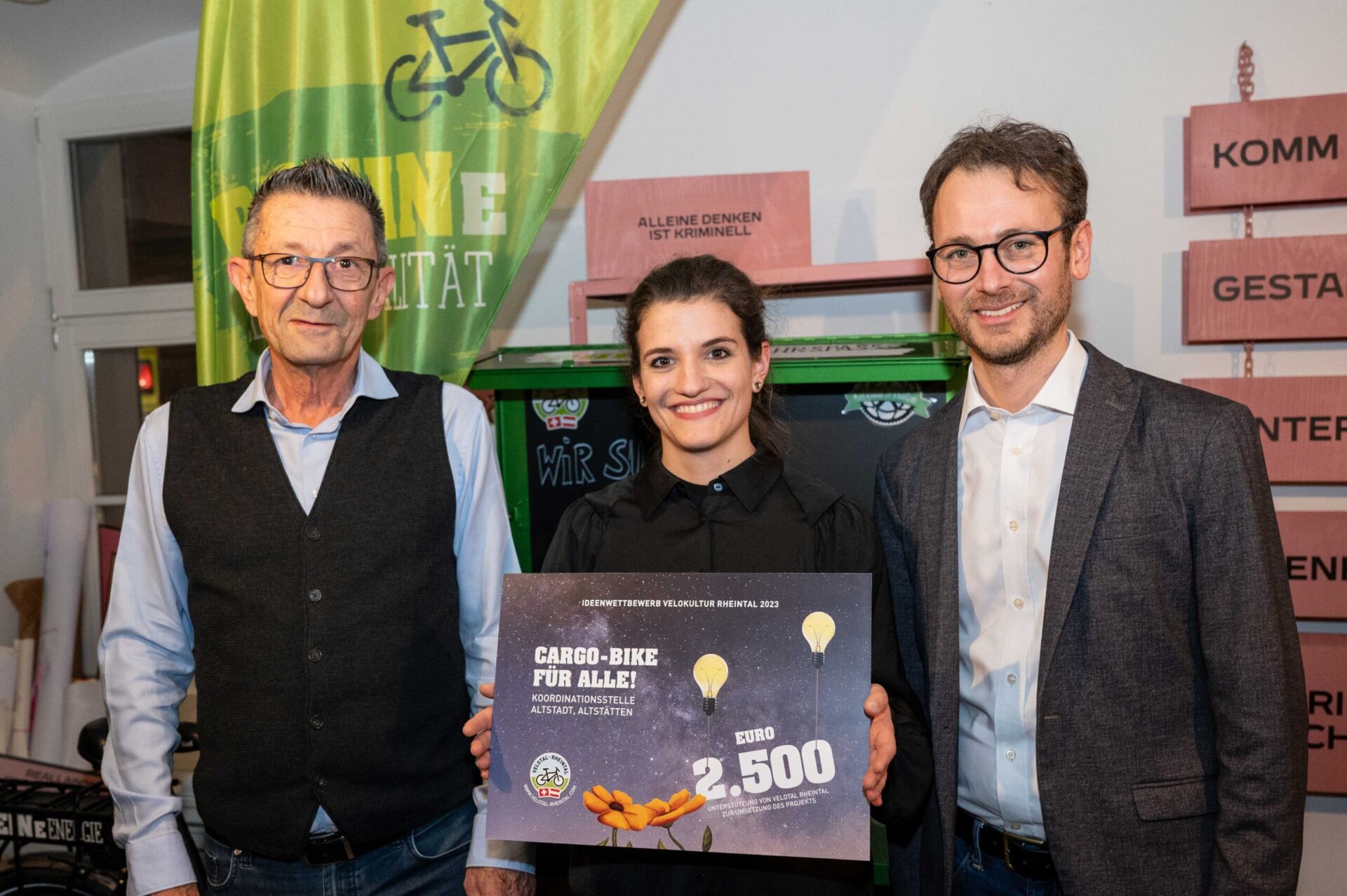 Am 18. Januar 2024 überreichten Mobilitätslandesrat Daniel Zadra und Reto Friedauer, Präsident des Vereins Agglomeration Rheintal, in Altstätten insgesamt 10‘000 Franken an die Gewinner:innen des Ideenwettbewerbs Velokultur Rheintal 2023. Bis Ende September des letzten Jahres konnten Projekte eingereicht werden, die Velo- bzw. Radkultur im St. Galler und Vorarlberger Rheintal fördern. 14 Vorarlberger und Schweizer Projekte wurden abgegeben. Die Wettbewerbsjury hat sechs Einreichungen prämiert.