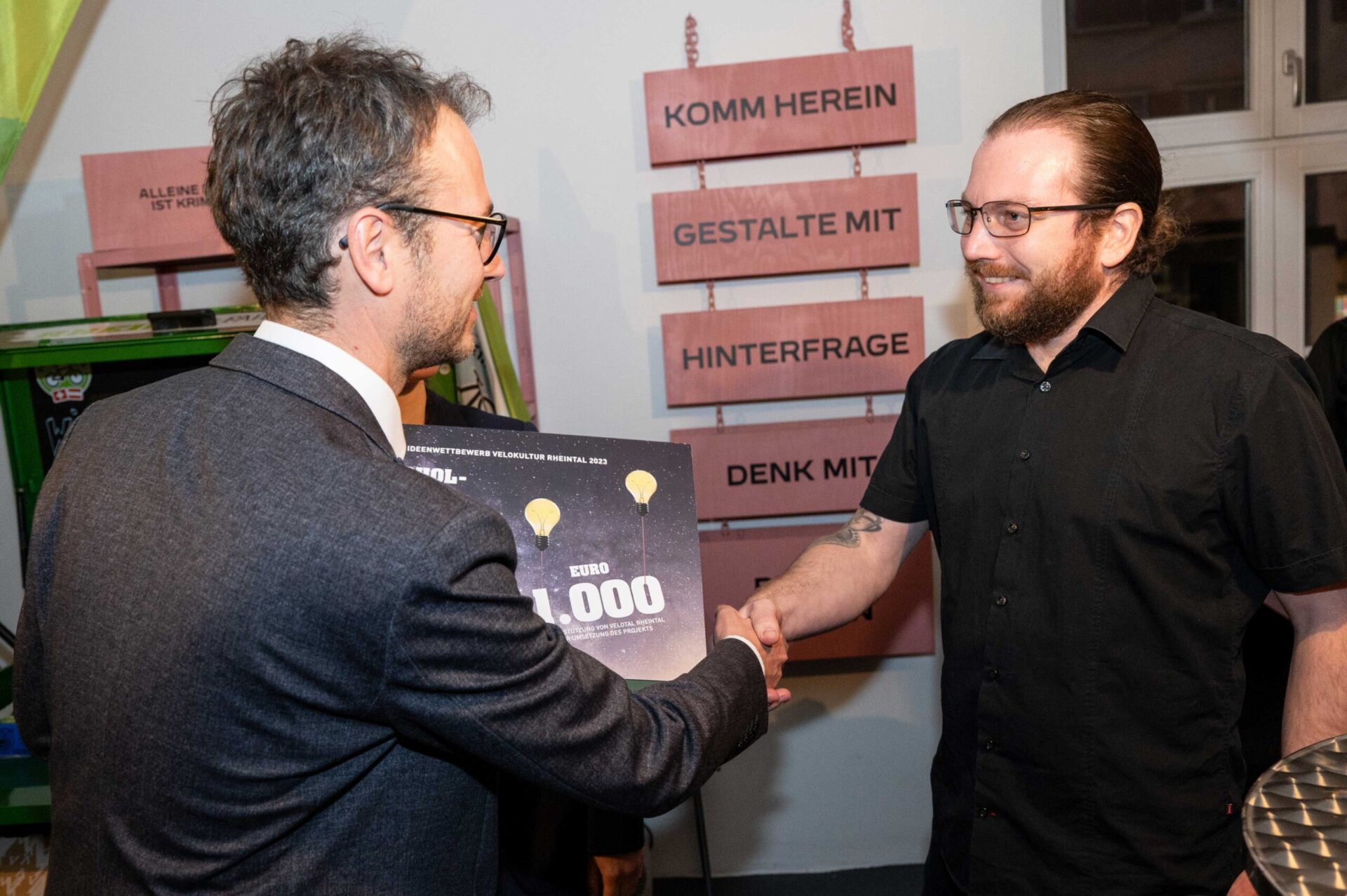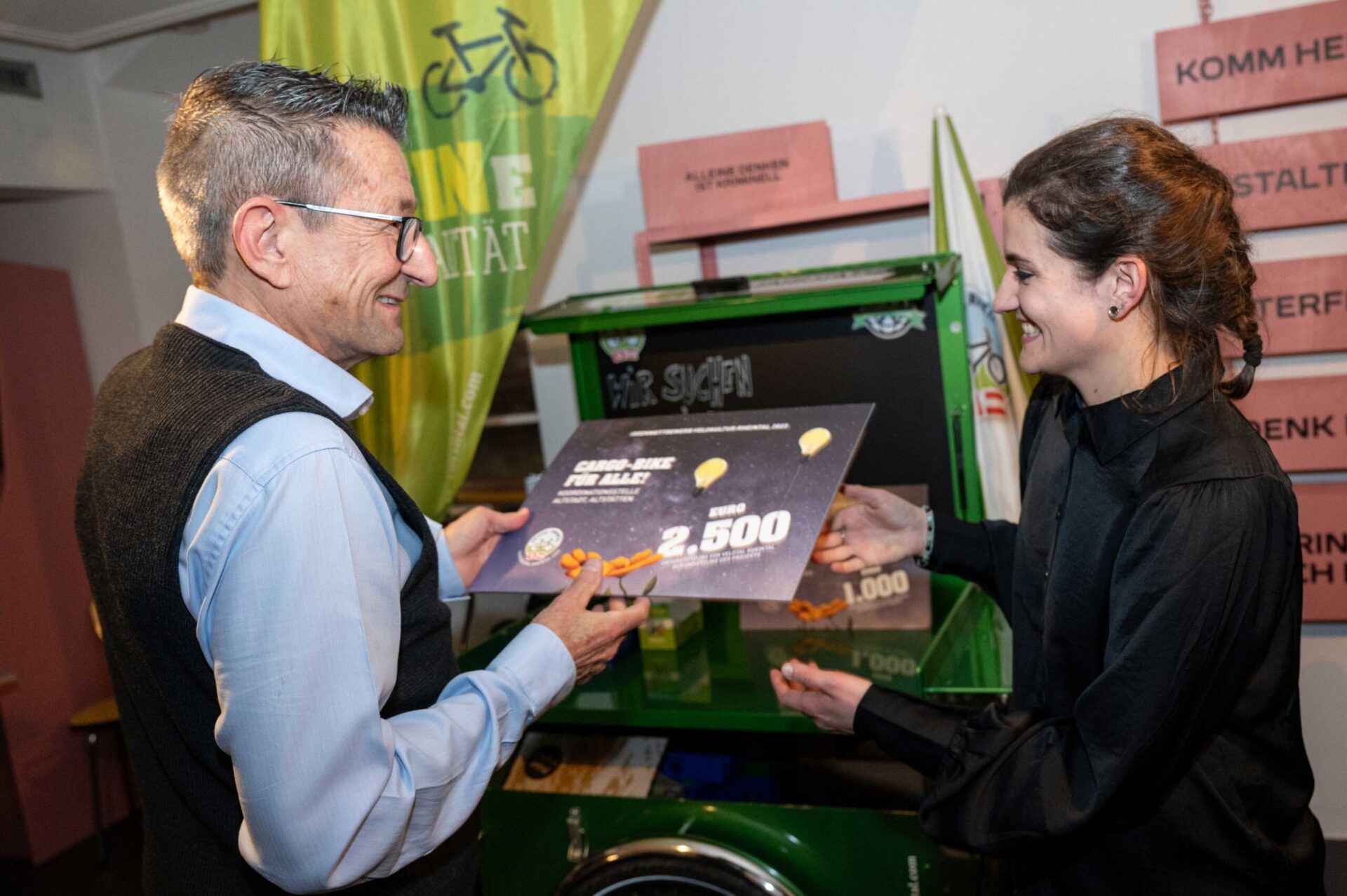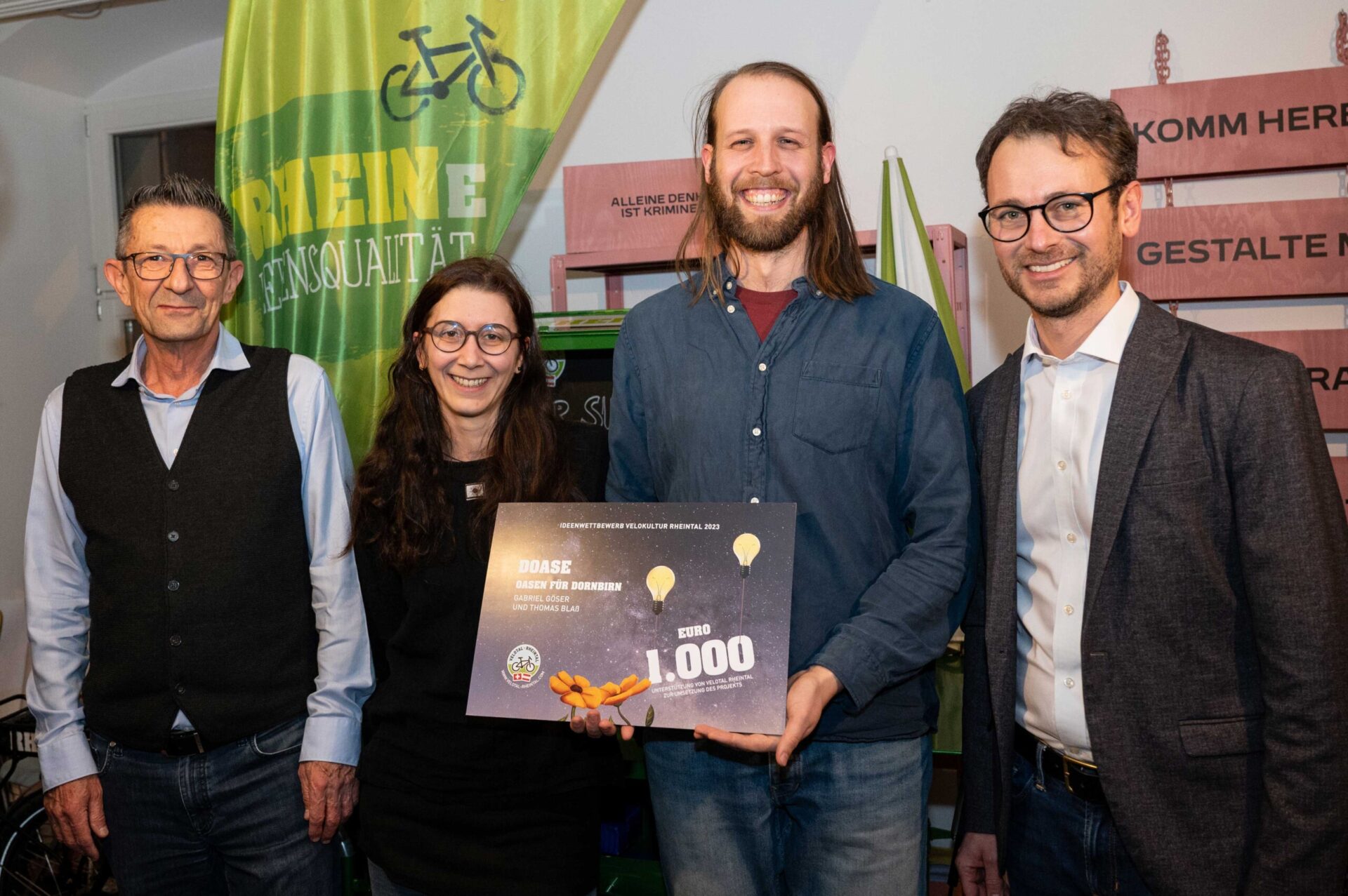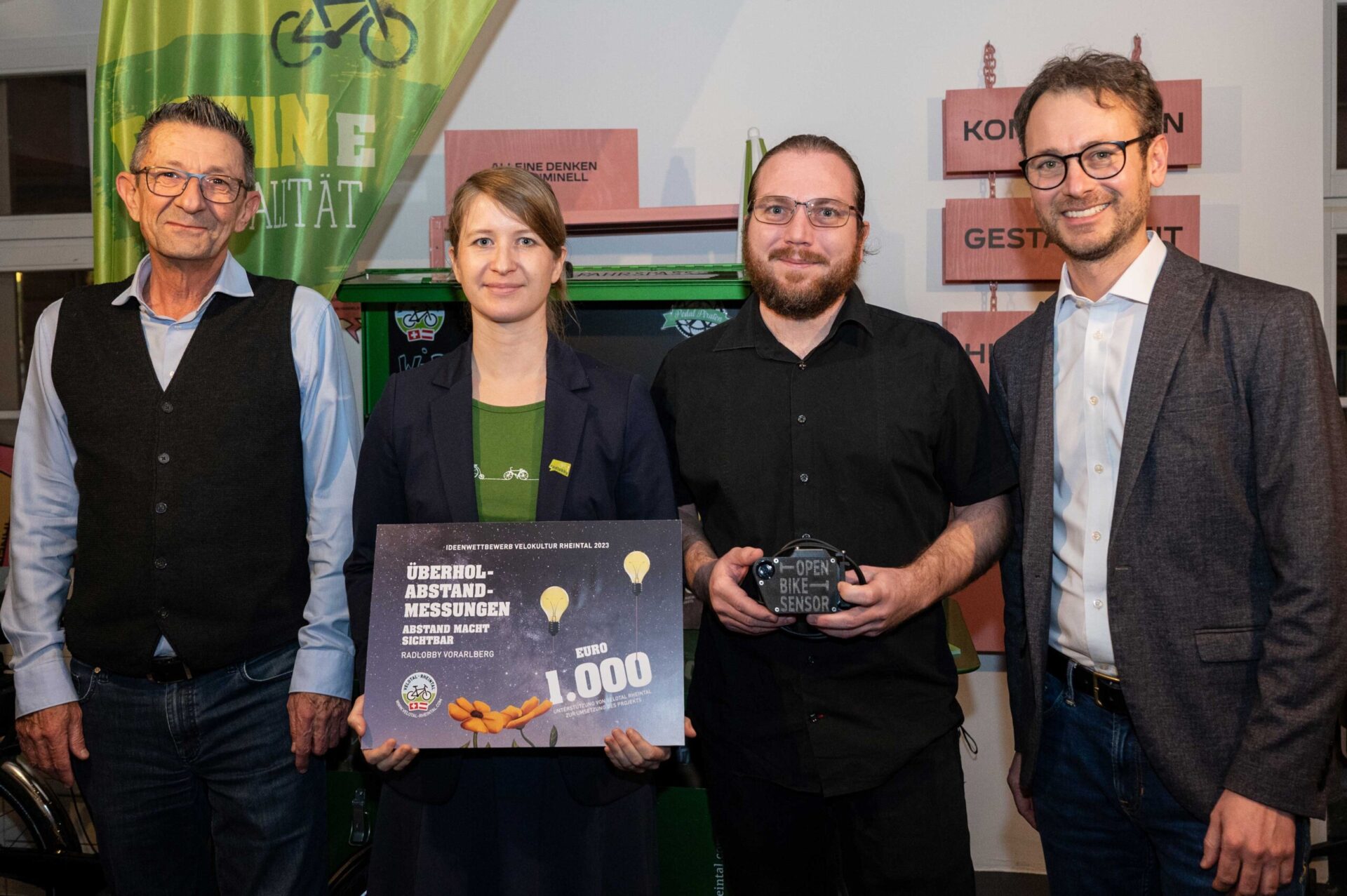 Am 18. Januar 2024 überreichten Mobilitätslandesrat Daniel Zadra und Reto Friedauer, Präsident des Vereins Agglomeration Rheintal, in Altstätten insgesamt 10‘000 Franken an die Gewinner:innen des Ideenwettbewerbs Velokultur Rheintal 2023. Bis Ende September des letzten Jahres konnten Projekte eingereicht werden, die Velo- bzw. Radkultur im St. Galler und Vorarlberger Rheintal fördern. 14 Vorarlberger und Schweizer Projekte wurden abgegeben. Die Wettbewerbsjury hat sechs Einreichungen prämiert.